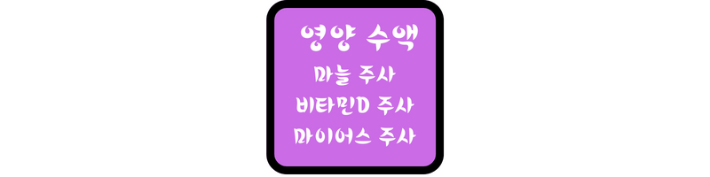 영양 수액 중 마늘 주사, 비타민D 주사, 마이어스 주사에 대해 빠르게 알아보겠습니다.