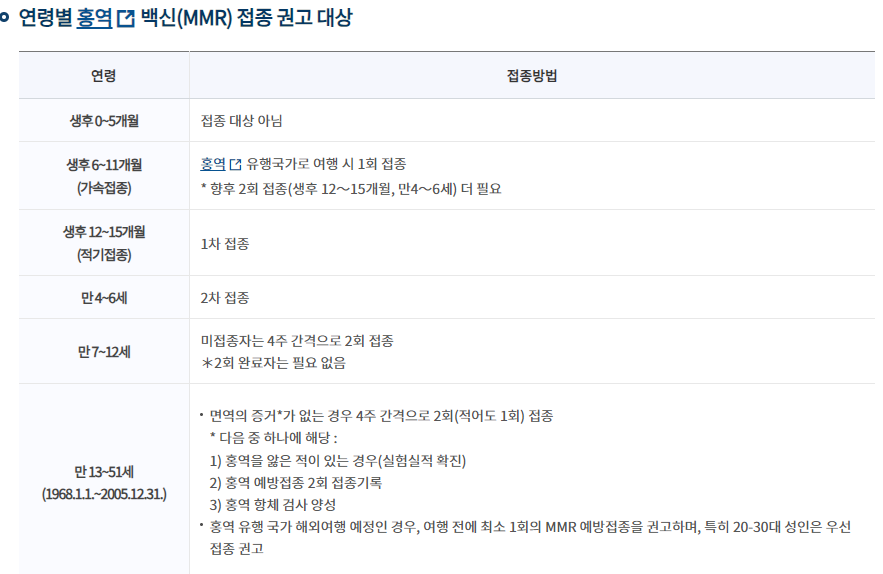 아래 표는 질병관리청 MMR 접종 권고 대상표입니다.